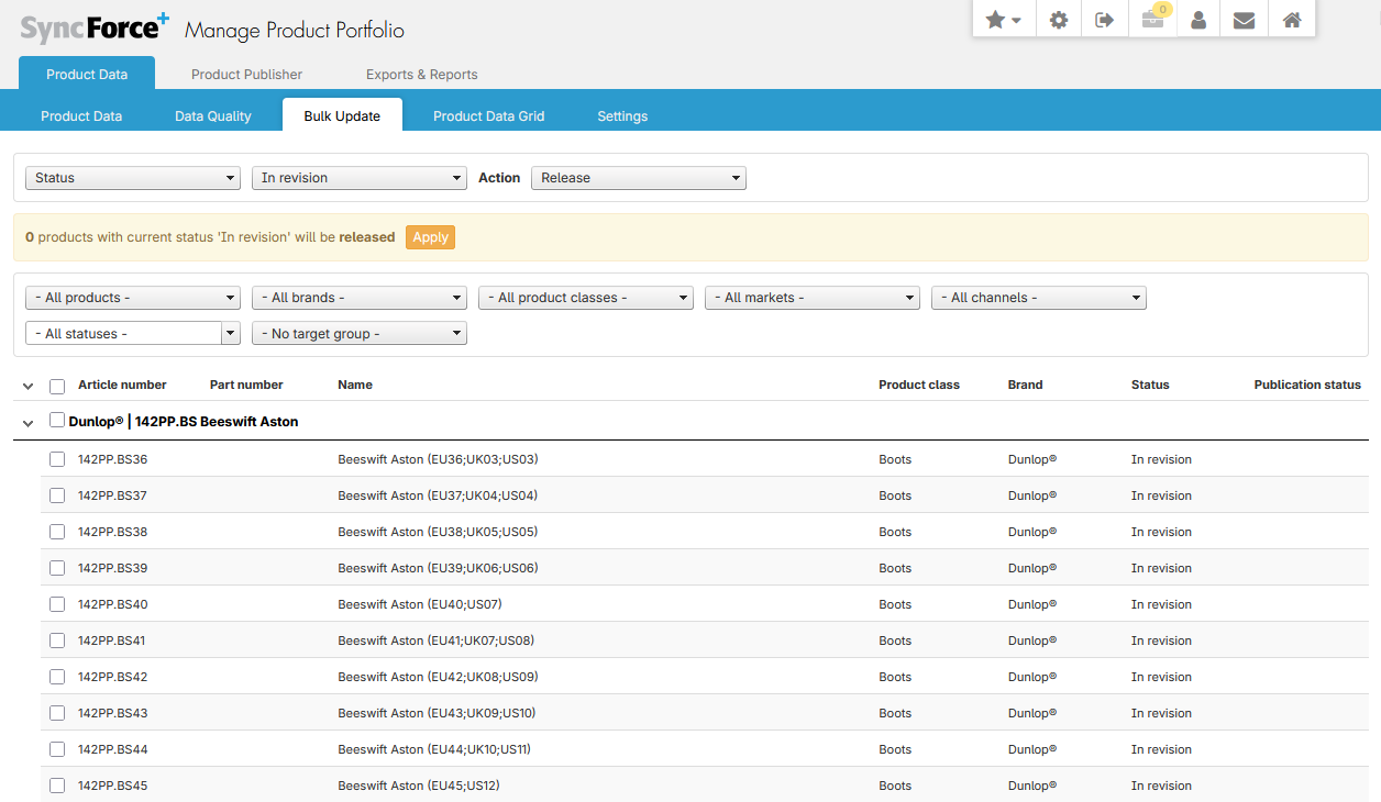 Sometimes you have the need to bulk Release a lot of your In Revision products. For example after a bulk import made a lot of updates or when meta data translations were set that affect a lot of products.