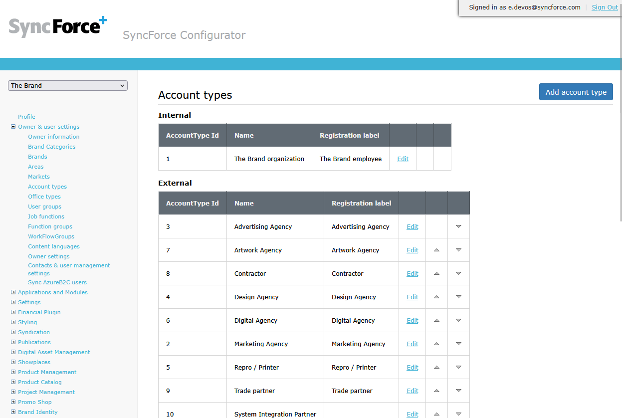 - Open the filter dropdownlist and select the internal account type. For example 'The Brand organization' in the screenshot below.